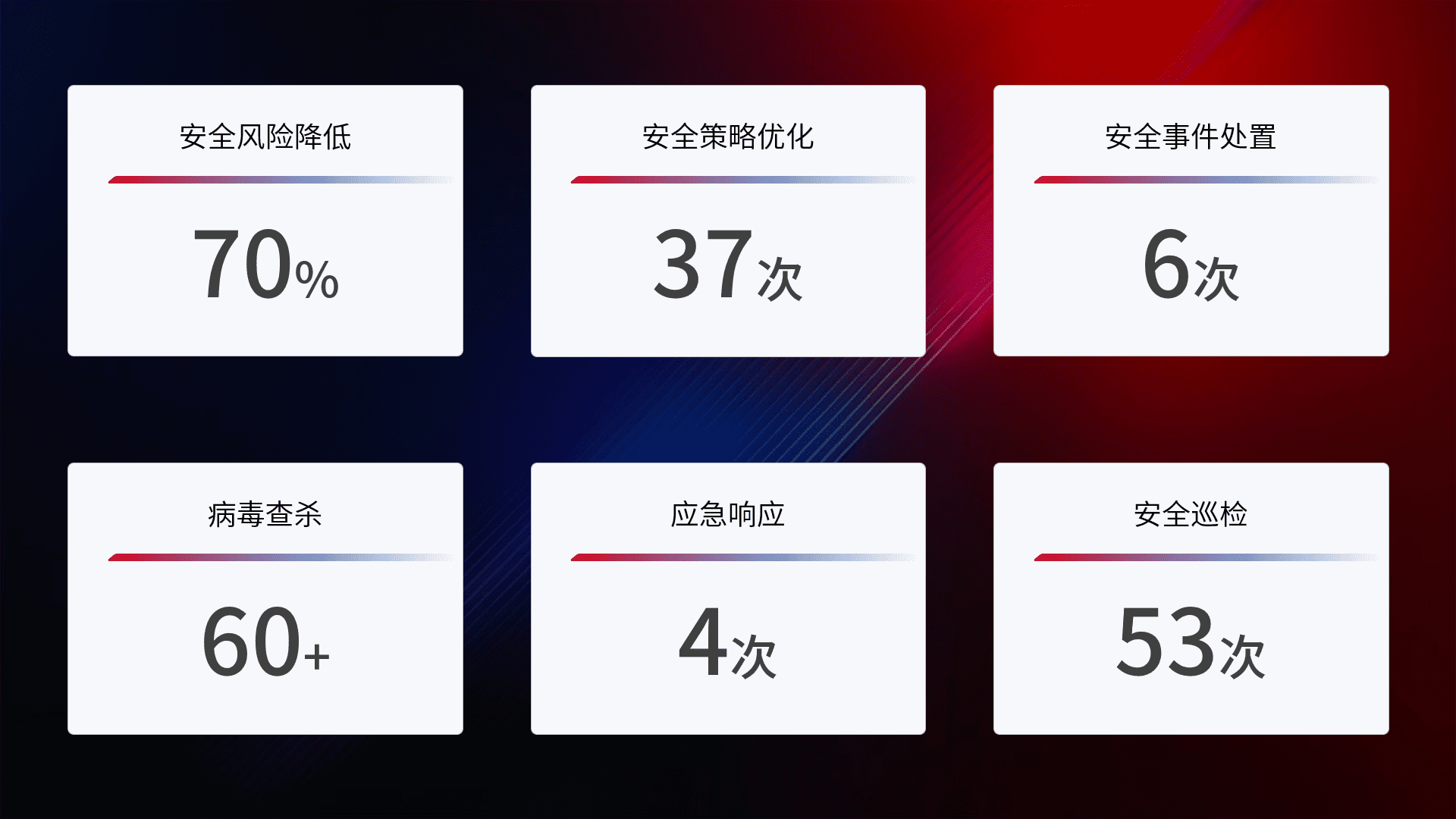 综合报告与文档服务: 定期提供安全事件处置报告、、周/季度总结报告和年度总结报告;详尽的文档服务可帮助客户了解网络安全状况,,,,支持决策制定和流程优化。。。