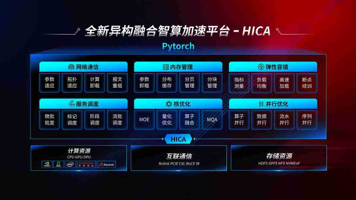 通过自研的服务层、、、、中间适配层、、、、以及调度编排算法,,,,采用数据并行、、模型并行等多种并行方式,,,,把并行计算任务进行有效的分解,,,使其分别由相应的软件栈和算力资源来承接。。。。当GPU资源变化,,,,HICA可以实时动态调度计算子任务并调整模型拓扑和架构,,以充分聚合各种算力资源。。