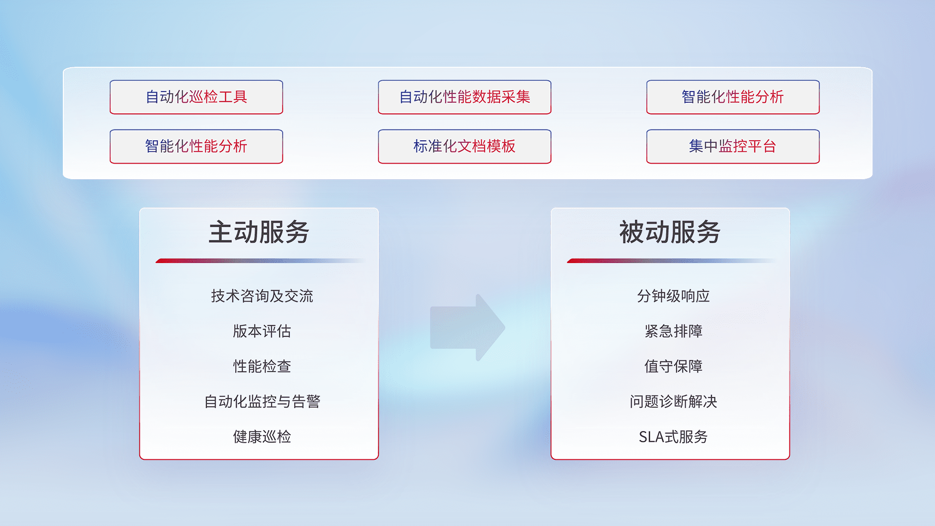 智能化工具和标准化文档,,保障服务质量,,,提供主动服务(包含技术咨询、、版本评估、、、、性能检查、、、、自动化监控与告警、、、健康巡检)和被动服务包含(分钟级响应、、、、紧急排障、、值守保障、、、、问题诊断解决、、SLA服务)。。。。